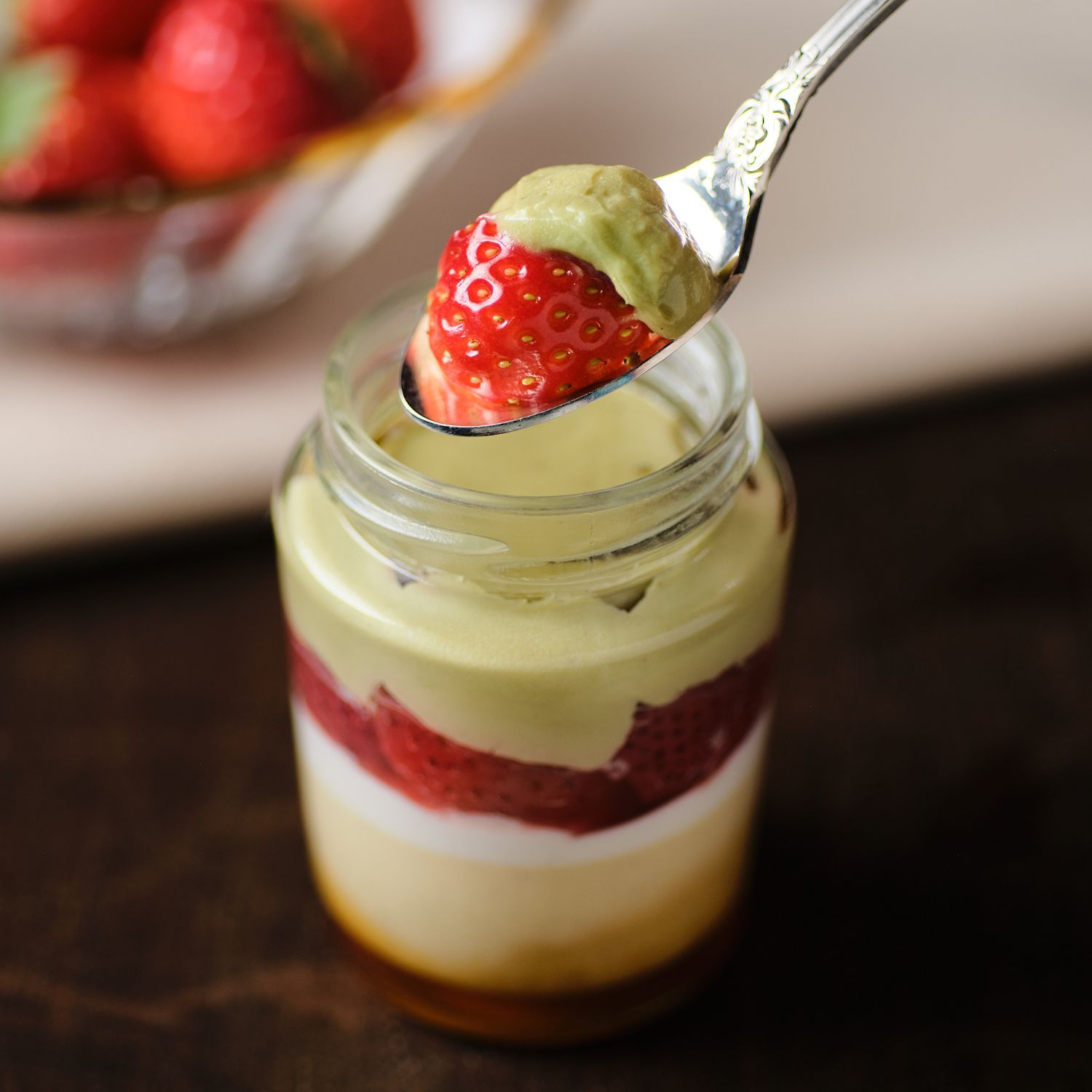 甘酸っぱい苺のマリネに、なめらかなピスタチオのバタークリーム。
